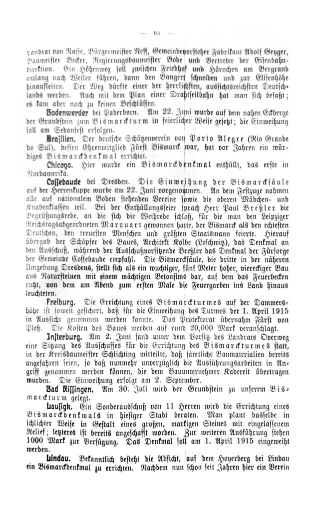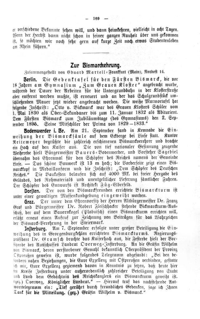 …7 сентября состоялось торжественное открытие воздвигнутой в Георгенбургкелене башни Бисмарка. Президент правительств[енного округа Гумбиннен] доктор наук Грамш провозгласил здравицу кайзеру, речь держал председатель [строительной] комиссии инстербургский земельный советник Овервег…